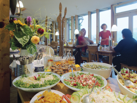 Und bunt ist auch das Essensangebot, aber selbstverständlich immer zu 100% aus ökologischer Erzeugung mit Wildsammlung. Barbara Kenner isst vegetarisch, ihr Mann flexibel und die Tochter vegan. Genauso wie viele Gäste, die hier sehr willkommen sind. Gemüse steht im Vordergrund der Buffets, die 2 x täglich serviert werden.