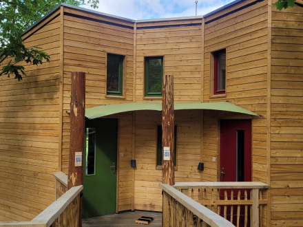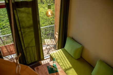 Seit 2023 gibt es architektonische einmalige Baumhäuser mit hyperboloiden Grasdächern – selbstverständlich nachhaltig von Grund auf und ausgestattet mit Bädern und Balkonen.