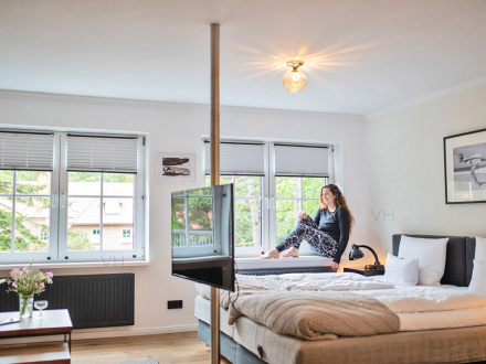 Die 36 Zimmer und Suiten verteilen sich auf insgesamt drei Etagen. Die Inhaber verordneten den Räumen einen harmonischen Stilmix aus gelassenem skandinavischem Design mit antiken Einzelstücken und modernem Mobiliar. Leuchtendes, erfrischendes Weiß dominiert in allen Zimmern, graue und schwarze Eyecatcher setzen gekonnte Akzente. Für Wärme und Behaglichkeit sorgt der naturfarbene Holzfußboden aus Eiche.