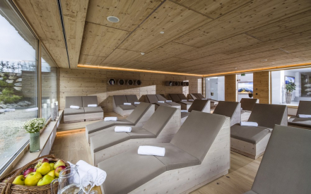 Sauna- und Badelandschaft, Behandlungsräume für Massagen und große windgeschützte Ruheterrassen mit Liegestühlen und Wolldecken.