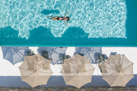 Der Name „Koukoumi“ des ersten ausschließlich veganen 5-Sterne-Hotel in Griechenland, bedeutet im mykonischen Dialekt „windgeschützter, gemütlicher Ort zum Kuscheln“.
