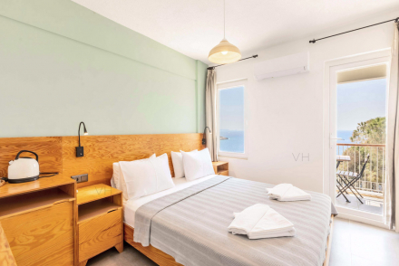 Unsere modernen Zimmer sind speziell auf Ihre Bedürfnisse abgestimmt und bieten Ihnen alles, was Sie für einen unvergesslichen Urlaub benötigen. Die Zimmer im Obergeschoss verfügen über einen privaten Balkon mit Meerblick und die Zimmer im Erdgeschoss haben eine kleine Terrasse mit teilweisem Meerblick. Wir haben kürzlich unser Hotel, einschließlich der Zimmer, Bäder, Poolterrasse und des Restaurantbereichs, renoviert, um unseren Gästen mehr Komfort und Nachhaltigkeit zu bieten.