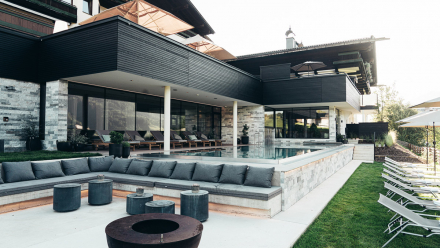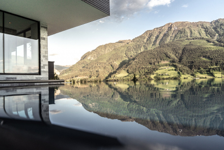 The spa area features a sauna, a Jacuzzi, a bio sauna and a terrace with mountain views, and a sunny panoramic relaxation room.