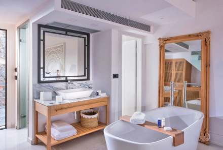 The shimmering turquoise waters of the Aegean provide a dramatic backdrop for the 152 exclusively-designed rooms, suites and villas with 71 pools, 14 unique room types.