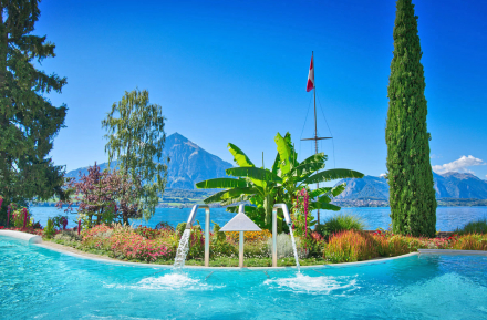 Between Bern and Interlaken, the BEATUS Wellness & Spa Hotel with direct lake access is located in the middle of a 12,000m² Mediterranean park on the riviera of Lake Thun. Combine culinary delights with picturesque sunsets and relaxing wellness days with personal hospitality. Enjoy a peaceful and relaxing stay and recharge your batteries in your vacation paradise.