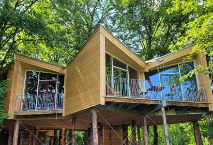 Since 2023 there are architecturally unique tree houses with hyperboloid grass roofs – of course sustainable from the ground up and equipped with bathrooms and balconies.