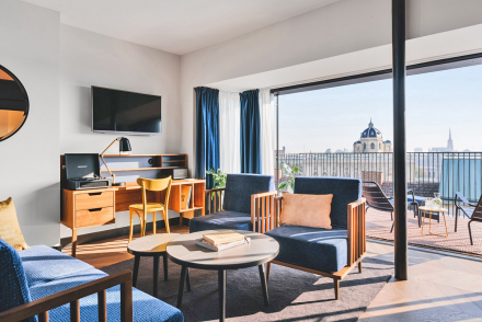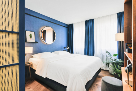 Gilbert is a sustainable hotel that places a lot of emphasis on predominantly regional partnerships. In addition to the impressive flora inside and on the facade, the gourmet cuisine, for which the handpicked suppliers and producers mostly come from Vienna and its close surroundings, the coffee, for example, comes from the Viennese roastery Süssmund and the natural cosmetics from Lederhaas Cosmetics. On the roof of the Gilbert there is a herb garden as well as beehives. “Cleaning without detergents” and thus cleaning exclusively with hot water steam is also on the sustainability agenda.