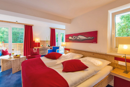 You’ll stay in modern, cozy rooms with pine or larch wood furnishings, combined with fresh, cheerful colors and specially made artwork.