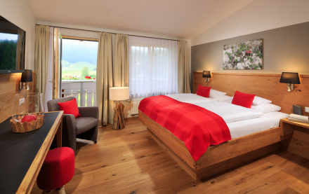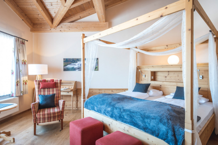 The comfortable hotel rooms in alpine style – single, double and family rooms – offer plenty of space for comfortable relaxation. Ecological materials and harmonious fabrics provide alpine living comfort and cozy retreat.
