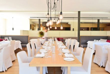 The restaurant is rendered in the finest contemporary Minimalist style. The walls and furnishings are made of wood, contrasting with darker architectural elements made of black steel, which refer to the space’s former function as smithy. Here, our cooking team prepares delicious meals.